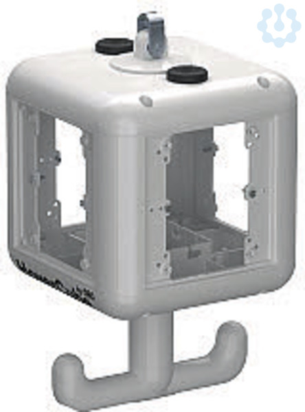 Leergehäuse mit Aufhängeöse und Griffhaken, zum Einbau von 4 elektrischen Betriebsmitteln, mit beigelegter Trennwand. Ohne Abdeckplatten.