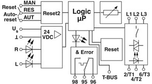 Hybrid-Motorstarter als Alternative zur klassischen Wendeschützschaltung. Reversiert 3~ AC Motoren bis 9 A und bietet Motorschutz. Mögliche Versorgung und Relaiserweiterung über Tragschienen-Busverbinder.