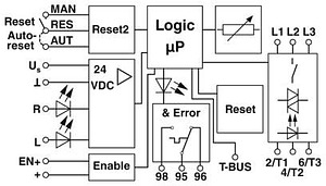 Hybrid-Motorstarter als Alternative zur klassischen Wendeschützschaltung. Reversiert 3~ AC-Motoren bis 3 A, bietet Motorschutz und Not-Halt bis SIL 3 / PL e. Mögliche Gruppenabschaltung, Versorgung und Relaiserweiterung über Tragschienen-Busverbinder.