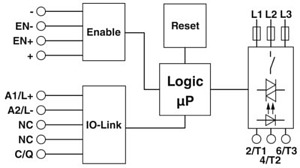 Hybrid-Motorstarter. Funktionen: Motor starten Motor reversieren, Motorschutz, Not-Halt, Vernetzbar, Kurzschlussschutz. Eingang: 24 V DC. Ausgang: 3~, 500 V AC, 3 A. Anschlussart: Schraub- und Push-in-Anschluss. Anbindung an das IO-Link-System