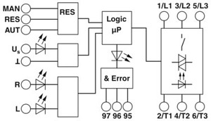 Hybrid-Motorstarter, Reversieren von 3~ AC-Motoren bis 550 V AC / 2,4 A, 24 V DC Eingang, Class 10 Auslösecharakteristik, Überlastfunktion, ohne Symmetrieüberwachung und ohne Phasenausfall- und Unterlasterkennung. Schalten von 1-phasigen Motoren möglich.