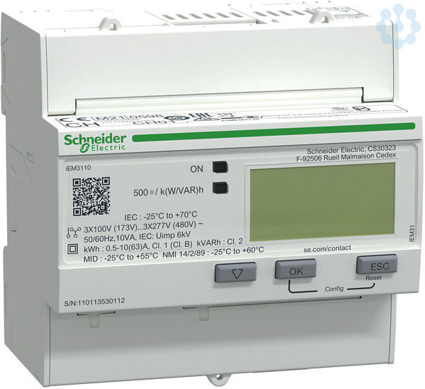 Acti 9 iEM3000 Baureihe. iEM3110 Energiezähler, 3-phasig, mit Teilzähler. Ausgang_S0 1, MID Ja, max. Bemessungsstrom 63 A.