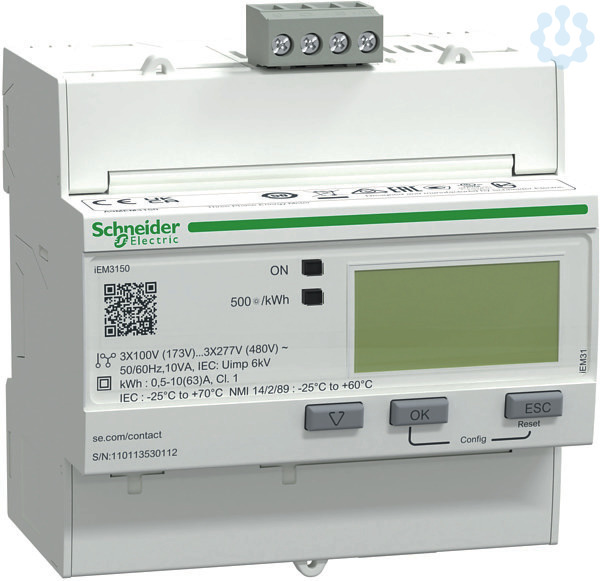 Acti 9 iEM3000 Baureihe. iEM3150 Energiezähler, 3-phasig, erweiterte Messfunktion. COM Modbus, max. Bemessungsstrom 63 A. Drehstromzähler für Direktmessung bis 63 A. Anzeige vollgraphische LCD-Anzeige zur gleichzeitigen Klartextdarstellung von Menüpunkt/Messkategorie, Messwert, Einheit sowie aktivem Tarif. Teilzähler werden mit Zeitstempel (Datum&Uhrzeit) der letzten Rücksetzung angezeigt bzw. kommuniziert. Messfunktion Gesamt-Wirkenergiezähler ohne Resetfunktion und Teil-Wirkenergiezähler mit Resetfunktion. Erweiterte Messfunktion für Energiezähler über Anzeige und Kommunikation Wirk-/Blindenergiezähler und Strom pro Phase, Wirkleistung, Leistungsfaktor gesamt, Spannungsmittelwert. Nur über Kommunikation Spannung, Wirkleistung pro Phase, Frequenz. Weitere Bestelloptionen Verrechnungszählung MID konform gemäß EN 50470-3 (ehem. PTB-Zulassung), Wirkenergiezähler Gesamt und pro Phase. Schutzart Front IP 40, Gehäuse IP 20 (Hinweis zu MID Varianten für Konformität mit der Europäischen Messgeräterichtlinie MID 2004