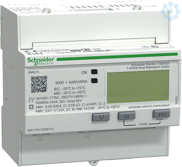 Acti 9 iEM3000 Baureihe. iEM3215 Energiezähler, 3-phasig,mit Teilzähler, 4 Tarife. Eingang_T 2, MID Ja, max. Bemessungsstrom 1 / 5. Drehstromzähler für Wandlermessung x/1 A bzw. x/5 A bis 6300 A. Anzeige vollgraphische LCD-Anzeige zur gleichzeitigen Klartextdarstellung von Menüpunkt/Messkategorie, Messwert, Einheit sowie aktivem Tarif. Teilzähler werden mit Zeitstempel (Datum&Uhrzeit) der letzten Rücksetzung angezeigt bzw. kommuniziert. Messfunktion Gesamt-Wirkenergiezähler ohne Resetfunktion und Teil-Wirkenergiezähler mit Resetfunktion. Weitere Bestelloptionen Verrechnungszählung MID konform gemäß EN 50470-3 (ehem. PTB-Zulassung), Wirkenergiezähler Gesamt und pro Phase. Schutzart Front IP 40, Gehäuse IP 20 (Hinweis zu MID Varianten für Konformität mit der Europäischen Messgeräterichtlinie MID 2004/22/EG muss das Messgerät in einem Schrank oder Gehäuse mit Schutzart IP51 oder besser verbaut sein).