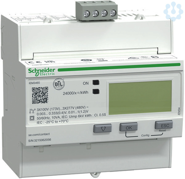 Acti 9 iEM3000 Baureihe. iEM3465 Energiezähler, 1 DI, 1 DO. Ausgang_K 1, COM BAC, Eingang_K 1, max. Bemessungsstrom LVCT. Drehstromzähler für LVCT-Klappwandler bis 2400 A. Anzeige vollgraphische LCD-Anzeige zur gleichzeitigen Klartextdarstellung von Menüpunkt/Messkategorie, Messwert, Einheit sowie aktivem Tarif. Teilzähler werden mit Zeitstempel (Datum&Uhrzeit) der letzten Rücksetzung angezeigt bzw. kommuniziert. Messfunktion Gesamt-Wirkenergiezähler ohne Resetfunktion und Teil-Wirkenergiezähler mit Resetfunktion. erweiterte Messfunktion für Energiezähler über Anzeige und Kommunikation Wirk-/Blindenergiezähler und Strom pro Phase, Wirkleistung, Leistungsfaktor gesamt, Spannungsmittelwert. Nur über Kommunikation Spannung, Wirkleistung pro Phase, Frequenz. Weitere Bestelloptionen Verrechnungszählung MID konform gemäß EN 50470-3 (ehem. PTB-Zulassung), Wirkenergiezähler Gesamt und pro Phase. Schutzart Front IP 40, Gehäuse IP 20 (Hinweis zu MID Varianten für Konformität mit der Europäischen Messgeräterichtlinie MI