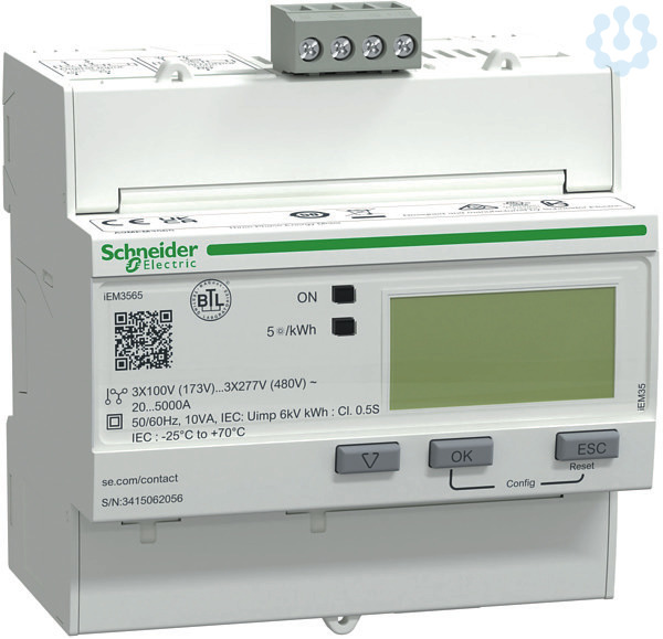 Acti 9 iEM3000 Baureihe. iEM3565 Energiezähler, 1 DI, 1 DO, Rogowski Wandler. Ausgang_K 1, COM BAC, Eingang_K 1, max. Bemessungsstrom ROG. Drehstromzähler für Rogowski-Flexwandler METSECTR bis 5000 A. Anzeige vollgraphische LCD-Anzeige zur gleichzeitigen Klartextdarstellung von Menüpunkt/Messkategorie, Messwert, Einheit sowie aktivem Tarif. Teilzähler werden mit Zeitstempel (Datum&Uhrzeit) der letzten Rücksetzung angezeigt bzw. kommuniziert. Messfunktion Gesamt-Wirkenergiezähler ohne Resetfunktion und Teil-Wirkenergiezähler mit Resetfunktion. erweiterte Messfunktion für Energiezähler über Anzeige und Kommunikation Wirk-/Blindenergiezähler und Strom pro Phase, Wirkleistung, Leistungsfaktor gesamt, Spannungsmittelwert. Nur über Kommunikation Spannung, Wirkleistung pro Phase, Frequenz. Weitere Bestelloptionen Verrechnungszählung MID konform gemäß EN 50470-3 (ehem. PTB-Zulassung), Wirkenergiezähler Gesamt und pro Phase. Schutzart Front IP 40, Gehäuse IP 20 (Hinweis zu MID Varianten für Konformität mit der Europäi