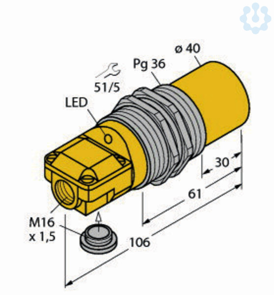 Induktiver Sensor, 2 Kabeleinführungen (axial, radial), Gewinderohr, Pg36, Messing verchromt, DC 4?Draht, 10...65 VDC, Wechsler, PNP?Ausgang, Klemmenraum, Bemessungsschaltabstand: 40 mm, nicht bündig
