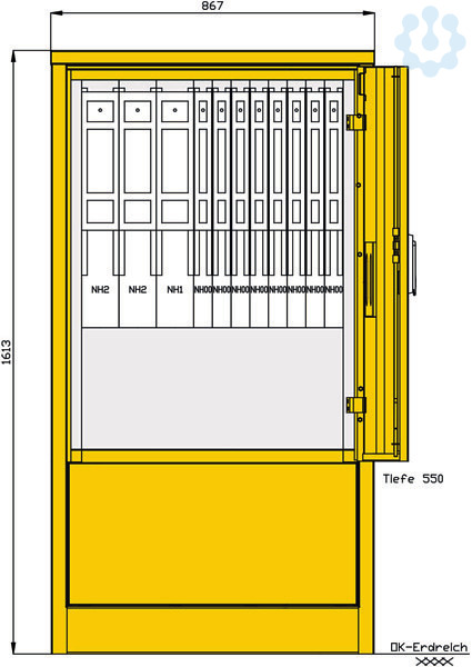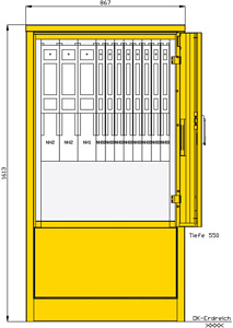 Gehäuse aus Edelstahl (Werkstoff 1.4301) mit Lackierung RAL 7032 -grau- mit Bodenflanschplatte und innenliegenden Bohrungen zur Befestigung mit Einfachtür und 3-Punkt-Stangenschloss sowie Schwenkhebel mit Profilhalbzylinder, Schließung G2123 sowie Kunststoff-Regenschutzkappe Einbauten schutzisoliert vordere Blende zur Montage abnehmbar Kabelausführung durch Gehäuseboden Schutzart: IP 44 Größe ca.: 1600 x 865 x 550mm / H-B-T