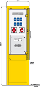 Gehäuse aus Edelstahl (Werkstoff 1.4301) mit Lackierung RAL 7032 -grau- mit Bodenflanschplatte und innenliegenden Bohrungen zur Befestigung mit Einfachtür und 3-Punkt-Stangenschloss sowie Schwenkhebel mit Profilhalbzylinder, Schließung G2123 sowie Kunststoff-Regenschutzkappe Einbauten bis einschl. RCD-Schutzschalter schutzisoliert vordere Blende zur Montage abnehmbar Kabelausführung bei geschlossener Tür möglich Schutzart: IP 44 Größe ca.: 1600 x 465 x 360mm / H-B-T
