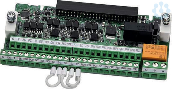 Klemmenblock für Vektorregelung. Es kann die Vektorregelung mit Encoder und geschlossener Regelschleife ausgeführt werden. Die Encoder-Rückführung ermöglicht hochpräzise Drehzahl-, Drehmoment- und Lageregelung.