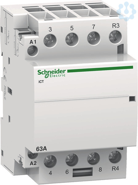 Installationsschütz Acti 9 iCT. Nennstrom 63A, 3S+1Ö, Steuerspannung 220/240V, 50Hz, Isolationsspannung (Ui) 500V AC. Schalten von Stromkreisen bis 100A. Klemmen IP 20. Geräuscharmes Schalten. Mechanische Schaltstellungsanzeige. Installationsschützen mit Vorwahl verfügen über einen frontseitigen Betriebsartenwahlschalter mit vier Schaltstellungen. Kompatibel mit der gesamten Produktreihe Acti 9. Der iCT Installationsschütz erfüllt folgende Normen- EN 61095 und IEC 1095. Des Weiteren ist diese Baureihe VDE zertifiziert!.