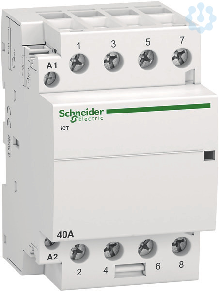 Installationsschütz Acti 9 iCT. Nennstrom 40A, 4S, Steuerspannung 220/240V, 50Hz, Isolationsspannung (Ui) 500V AC. Schalten von Stromkreisen bis 100A. Klemmen IP 20. Geräuscharmes Schalten. Mechanische Schaltstellungsanzeige. Installationsschützen mit Vorwahl verfügen über einen frontseitigen Betriebsartenwahlschalter mit vier Schaltstellungen. Kompatibel mit der gesamten Produktreihe Acti 9. Der iCT Installationsschütz erfüllt folgende Normen- EN 61095 und IEC 1095. Des Weiteren ist diese Baureihe VDE zertifiziert!.