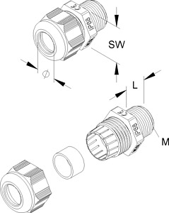 IPON-Kabelverschraubung, mit langem metrischem Anschlussgewinde nach DIN EN 60423. Nenngröße