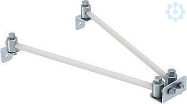 V-Befestigung für eine isolierte Fangeinrichtung im Trennungsabstand s. - Montage an Wänden und Dachaufbauten mit zwei Wandanschluss-Winkeln - zum Einhalten des Trennungsabstandes zu elektrisch leitenden Teilen nach VDE 0185-305-3 (IEC 62305-3) - Aufnahme von Fangstangen und Rundleitern mit 8, 16 und 20 mm Durchmesser - UV-stabilisiert und witterungsbeständig - Dauertemperaturbereich -50°C bis +100°C - Materialfaktor km= 0,7