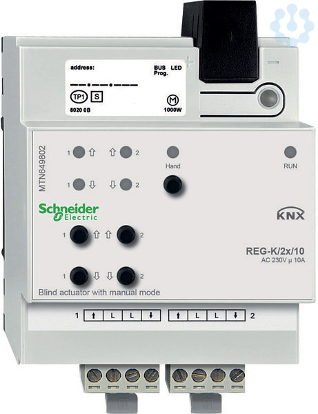 Schneider Electric KNX. Zum unabhängigen Steuern von 2 Jalousie-/Rollladenantrieben. Die Funktion der Jalousiekanäle ist frei konfigurierbar. Alle Jalousieausgänge lassen sich mit Tasten manuell betätigen. Anzeige der Kanalzustände über LEDs, Eine grüne LED zeigt die Betriebsbereitschaft an. Mit integriertem Busankoppler. Für die Montage auf Hutschienen TH35 nach EN 60715. Der Busanschluss erfolgt über eine Busanschlussklemme. Nennspannung: AC 230 V, 50-60 Hz, Nennstrom: 10 A, cos Phi 0,6 Motorlast: AC 230 V, max. 1000 W, Externe Hilfsspannung (optional): AC 110-240 V, 50-60 Hz, max. 2 VA, Gerätebreite: 8 TE entspricht ca. 144 mm. Lieferumfang: Mit Busanschlussklemme und Leitungsabdeckung.