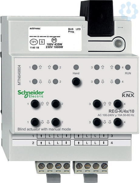 Schneider Electric KNX. Zum unabhängigen Steuern von 4 Jalousie-/Rollladenantrieben. Die Funktion der Jalousiekanäle ist frei konfigurierbar. Alle Jalousieausgänge lassen sich mit Tasten manuell betätigen. Anzeige der Kanalzustände über LEDs, Eine grüne LED zeigt die Betriebsbereitschaft an. Mit integriertem Busankoppler. Für die Montage auf Hutschienen TH35 nach EN 60715. Der Busanschluss erfolgt über eine Busanschlussklemme. Nennspannung: AC 230 V, 50-60 Hz, Nennstrom: 10 A, cos Phi 0,6 Motorlast: AC 230 V, max 1000 W, Externe Hilfsspannung (optional): AC 110-240 V, 50-60 Hz, max 2 VA. Gerätebreite: 8 TE entspricht ca 144 mm, Lieferumfang: Mit Busanschlussklemme und Leitungsabdeckung.