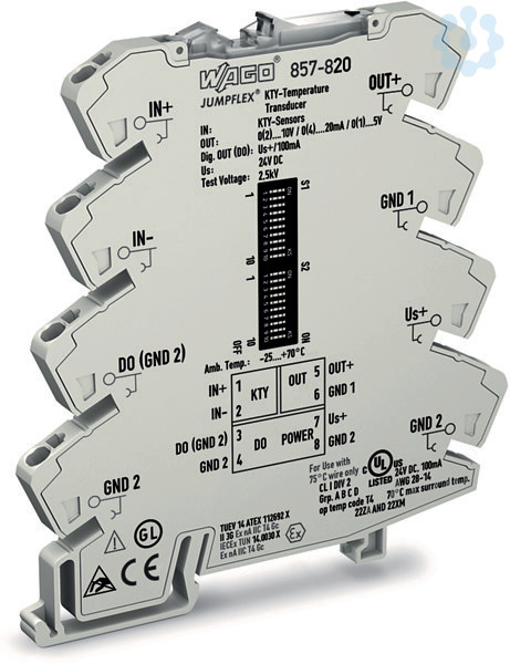 Temperaturmessumformer für KTY-Sensoren. Strom- und Spannungsausgangssignal. Konfiguration per DIP Schalter. Versorgungsspannung DC 24 V. 6 mm Baubreite. lichtgrau