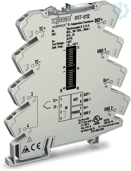 Temperaturmessumformer. für Thermoelemente. Strom- und Spannungsausgangssignal. Konfiguration per DIP Schalter. Versorgungsspannung DC 24 V. 6 mm Baubreite