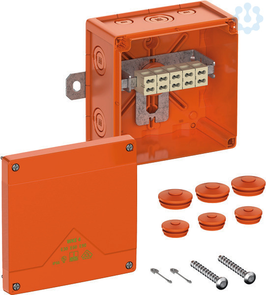Kabelabzweig- und Verbindungskasten mit IP66 zertifiziert nach EN 60670 und IEC 62208 mit elektrischem Funktionserhalt E30-E90 nach DIN 4102 Teil 12. Halogenfreies Gehäuse aus Spezialthermoplast, Klemmen aus hochtemperaturbeständiger Spezialkeramik, Klemmenhalter frei positionierbar, Schnellmontage durch Außenbefestigungslaschen, Verbindungskasten 5-polig 0,5-6qmm, Abzweigkasten 5-polig 0,5-6 qmm, Anzahl der klemmbaren Leiter pro Pol: 16 x 0,5q / 12 x 0,75q / 12 x 1q / 12 x 1,5q / 4 x 2,5q / 4 x 4q / 4 x 6q