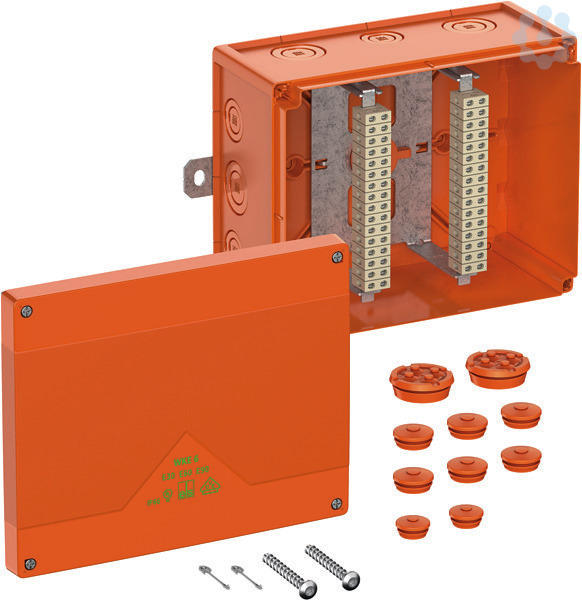 Kabelabzweig- und Verbindungskasten mit IP66 zertifiziert nach EN 60670 und IEC 62208 mit elektrischem Funktionserhalt E30-E90 nach DIN 4102 Teil 12. Halogenfreies Gehäuse aus Spezialthermoplast, Klemmen aus hochtemperaturbeständiger Spezialkeramik, Klemmenhalter frei positionierbar, Schnellmontage durch Außenbefestigungslaschen, Verbindungskasten 32-polig 0,5-2,5qmm, Abzweigkasten 32-polig 0,5-1,5qmm, Anzahl der klemmbaren Leiter pro Pol: 8 x 0,5q / 6 x 0,75q / 6 x 1q / 6 x 1,5q / 2 x 2,5q
