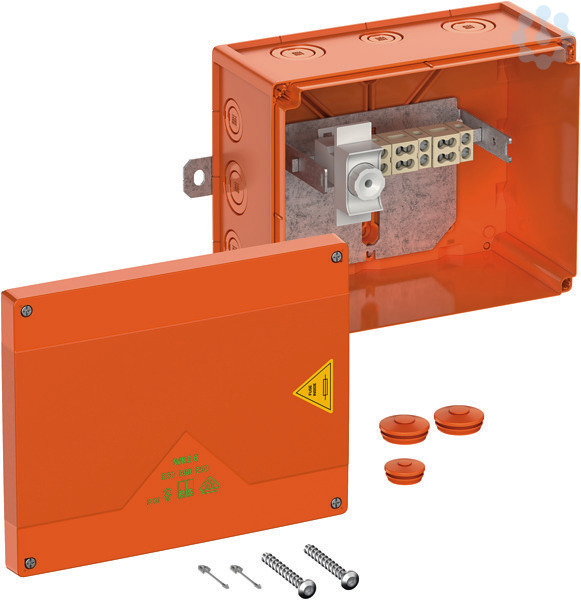 Kabelabzweig- und Verbindungskasten mit IP66 zertifiziert nach EN 61439 und IEC 62208 mit elektrischem Funktionserhalt E30-E90 nach DIN 4102 Teil 12. Halogenfreies Gehäuse aus Spezialthermoplast, Klemmen aus hochtemperaturbeständiger Spezialkeramik, Klemmenhalter frei positionierbar, Schnellmontage durch Außenbefestigungslaschen, Verbindungskasten 5-polig 1,5-10qmm, Abzweigkasten 3-polig 1,5-4qmm, Sicherung im Abzweig 1 x Sockel D01 (ohne Einsatz), Anzahl der klemmbaren Leiter pro Klemmstelle 4 x 1,5q / 3 x 2,5q / 2 x 4q / 1 x 6q / 1 x 10q