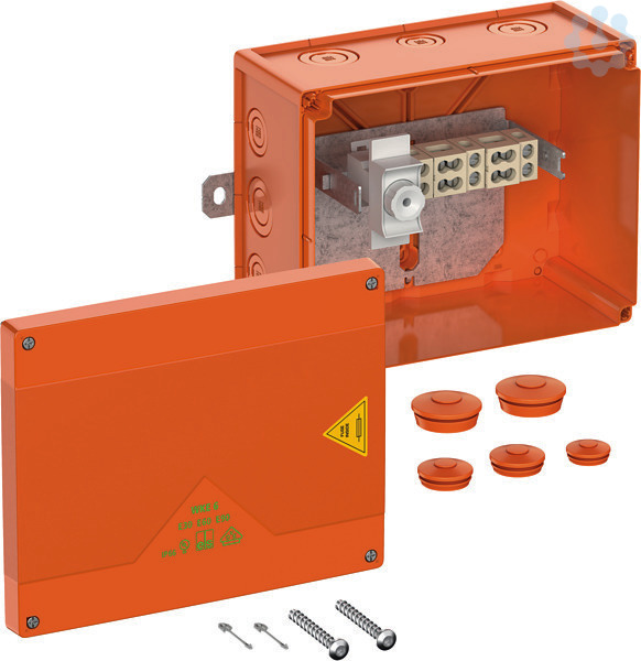 Kabelabzweig- und Verbindungskasten mit IP66 zertifiziert nach EN 61439 und IEC 62208 mit elektrischem Funktionserhalt E30-E90 nach DIN 4102 Teil 12. Halogenfreies Gehäuse aus Spezialthermoplast, Klemmen aus hochtemperaturbeständiger Spezialkeramik, Klemmenhalter frei positionierbar, Schnellmontage durch Außenbefestigungslaschen, Verbindungskasten 5-polig 1,5-16qmm, Abzweigkasten 3-polig 1,5-4qmm, Sicherung im Abzweig 1 x Sockel D01 (ohne Einsatz), Anzahl der klemmbaren Leiter pro Klemmstelle 5 x 1,5q / 4 x 2,5q / 2 x 4q / 2 x 6q / 1 x 10q / 1 x 16q