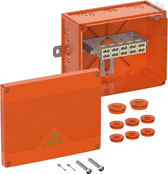 Kabelabzweig- und Verbindungskasten mit IP66 zertifiziert nach EN 60670 und IEC 62208 mit elektrischem Funktionserhalt E30-E90 nach DIN 4102 Teil 12. Halogenfreies Gehäuse aus Spezialthermoplast, Klemmen aus hochtemperaturbeständiger Spezialkeramik, Klemmenhalter frei positionierbar, Schnellmontage durch Außenbefestigungslaschen, Verbindungskasten 5-polig 1,5-16qmm, Abzweigkasten 5-polig 1,5-16qmm, Anzahl der klemmbaren Leiter pro Pol: 20 x 1,5q / 16 x 2,5q / 12 x 4q / 8 x 6q / 4 x 10q / 4 x 16q
