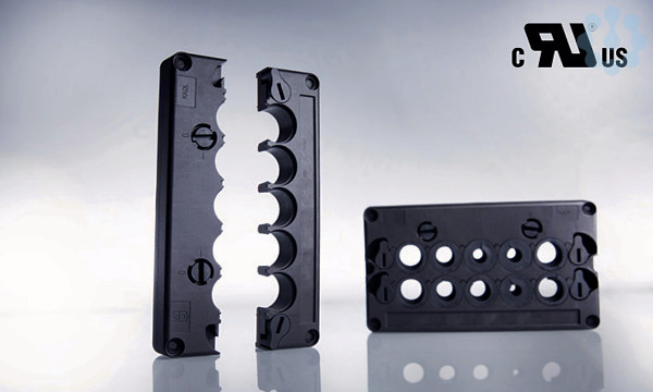 System zur Einführung und Abdichtung von konfektionierten Leitungen, werkzeugfreie Durchführungs- und Anschlusstechnik für Maschinen und Anlagen, modularer Aufbau, hohe Packungsdichte, Schutzart: IP65
