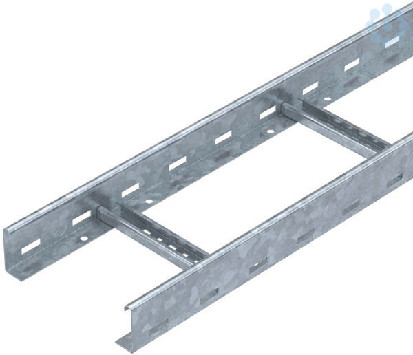 Kabelleiter in Seitenhöhe 60 mm mit gelochtem Seitenholm und mit eingenieteten, nach oben offenen C- Profil Sprossen (Ausführung VS). Die Befestigung auf dem Ausleger erfolgt mit Klemmstücken Typ LKS 40. Passende Bügelschelle Typ 2056.
