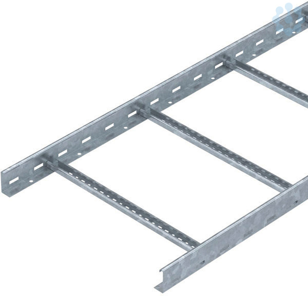 Kabelleiter in Seitenhöhe 60 mm mit gelochtem Seitenholm und mit eingenieteten, nach oben offenen C- Profil Sprossen (Ausführung VS). Die Befestigung auf dem Ausleger erfolgt mit Klemmstücken Typ LKS 40. Passende Bügelschelle Typ 2056.