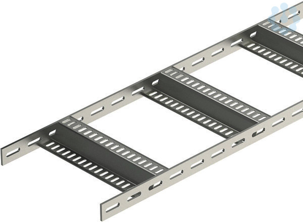 Schiffskabelleiter mit gelochtem Seitenholm in der Seitenhöhe 40 mm mit eingeschweißten, gelochten Z-Sprossen. Belastung geprüft nach IEC in Kombination mit Verbinder Typ SLV. Die Schiffsbau-Kabelleiter ist auf Anfrage auch in Stahl blank lieferbar.