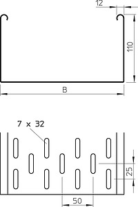 Mittelschweres-Kabelrinnen-System mit 110 mm Seitenhöhe. Kabelrinne mit Bodenlochung 7 x 32 mm zur Kabelbelüftung und zur Montageerleichterung. Seitenlochung 7 x 20 mm als Verbinderlochung. Mit oben eingerolltem Seitenholm zur Verstärkung und als Kantenschutz.