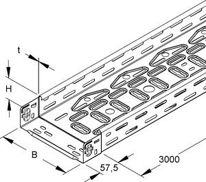 Kabelrinne, leicht, nach DIN EN 61537, mit angeprägtem Stoßstellenverbinder zur schraublosen Schnellbefestigung und mit versetzt angeordneter Boden- und Seitenperforation für stufenlose Befestigung und Anbringung der Systembauteile, Boden zusätzlich gesickt und mit durchgehend mittiger Schlüssellochperforation zur Abhängung mit Gewindestäben M 10/... versehen, mit durchgehend mittiger Bodenlochung sowie einer 2-reihigen aus der Mitte durchgehend symmetrisch angeordneten Bodenlochung zur Aufnahme von Kabelverschraubungen. Zur Verwendung im Funktionserhalt bitte Zusatzvorschriften beachten! Erforderliches Befestigungszubehör für den Funktionserhalt 4x FLM 6X12 bitte gesondert bestellen! VDE zertifiziert!