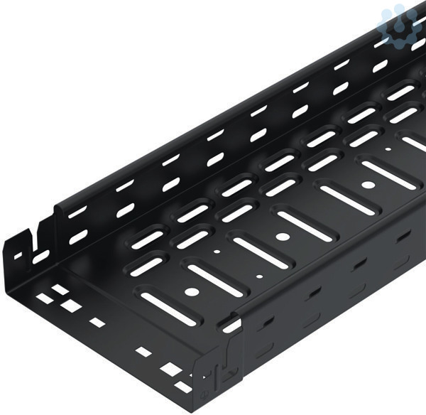 Kabelrinne mit integriertem Schnellbefestigungssystem. Bandverzinkte Oberfläche, pulverbeschichtet in tiefschwarz (RAL 9005). Durchgängige Seitenlochung von 7 x 20 mm für die Installation zusätzlicher Verbindungs- und Montagebauteile. Mit 11-mm-Lochung im Boden für die direkte Gewindestangenabhängung. Nutzlänge 3.000 mm.