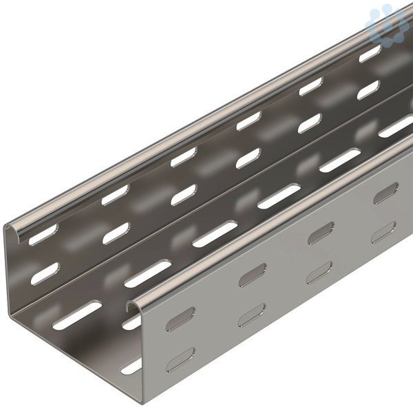 Schweres-Kabelrinnen-System mit 60 mm Seitenhöhe. Kabelrinne mit Bodenlochung 7 x 32 mm zur Kabelbelüftung und zur Montageerleichterung. Seitenlochung 7 x 20 mm als Verbinderlochung. Mit oben eingerolltem Seitenholm zur Verstärkung und als Kantenschutz.