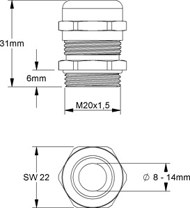 Kabelverschraubung, mit metrischem Anschlussgewinde nach DIN EN 60423, Dichtring sowie O-Ring am Anschlussgewinde, mit langem ausstoßbaren Dichteinsatz (Vollisolation), halogenfrei und silikonfrei. Nenngröße
