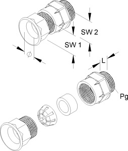 Kabelverschraubung mit Pg-Anschlussgewinde nach DIN 40430, mit Biegeschutz-Trompete, glasfaserverstärkt, mit Flammschutz, halogenfrei. Nenngröße