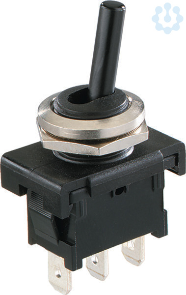 Kippschalter Serie 8400 6(4) A 250V Umschalter, 1polig, Steckanschluss 4,8mm Geeignet für Geräte der Schutzklasse II, Zentralbefestigung M 12x0,75mm, Sechskant- und Rädelmutter aufgeschraubt, Kipphebel und Gehäuse aus Thermoplast, Kontake aus Silber, Anschlüsse versilbert, geeignet zum sek. schalten von Halogenleuchten