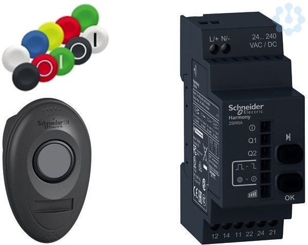 Funktasten ohne Batterie, DM 22 mm Harmony XB5 Kunststoff und XB4 Metall. Einsatzfertige Kombi-Pakete. Komplettsatz SPS, XB5, Kleingehäuse aus Kunststoff, 24-240V AC/DC, Funktaste ohne Batterie mit montiertem Befestigungsadapter, Frontelement DM 22 mm Typ ZB5R. Fertig montiert in ergon. Gehäuse, 1 Satz Tastenschilder, 10 Stück in versch. Farben (Auswahl eines zu montierenden Tastenschilds). Empfängertyp ProgrammierbarerEmpfänger, ausgestattet mit 2 Relaisausgängen Typ RT 3A (1),2 Tasten (Teach-in, Parametrierung), 6 LEDs (Spannungsanzeige,Ausgänge, Signalstärke). Kombi-Paket bestehend aus 1 Funktaste ohne Batterie, im ergonomischen Gehäuse. Monoflop-Ausgangsfunktion nicht programmierbar 1 Empfänger Taster und Empfänger werkseitig montiert.