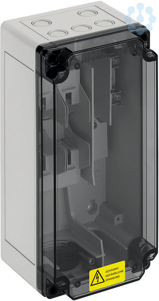 Netzanschlusskasten, Industrie Qualität, für 230 V Drehstrom-Netze (L1-L2-PE), In=25 A, Imax=63 A, bestückt mit: 2 x NH00 Sicherungselement, 1 x PE-Klemme, 1 x Parkbucht für 2 AdernAnschlussklemmen Zuleitung: Prismenklemme (2,5-50qmm CU, 16-50qmm AL)Anschlussklemmen Abgang: Schellenanschluss (2x 2,5-50qmm CU), Deckel transparent