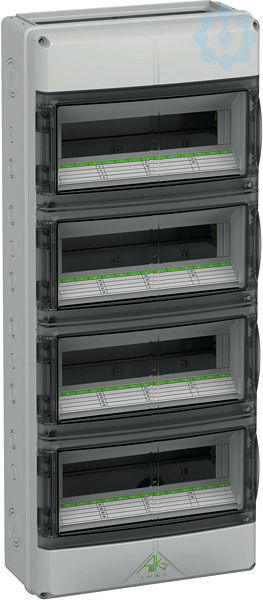 Kleinverteiler, Industrie Qualität, Flansch-Type, mit offenen Stirnflächen, zum Einsatz mit verschiedenen Flanschen, zur Kombination mehrerer AK-F-Verteiler mittels Kombiflansch, 4-reihig, 56 Teilungseinheiten, 150mm Schienenabstand, integrierte Belüftungselemente zur Verminderung der Kondenswasserbildung, Abdeck- und Beschriftungsstreifen, mit zusätzlichen Doppelmembranstutzen und weiterem Zubehör, Flansche und Flanschset sind separat zu erwerben, schraubenlose PE/N-Klemmschiene mit jeweils 6 schraubbaren Klemmstellen 2,5-16qmm, 21 / 2 x 14 schraubenlosen Klemmstellen 1,5mm-4qmm