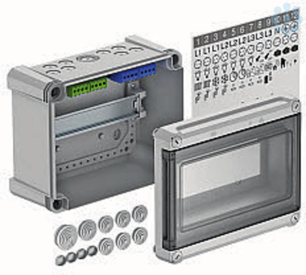 Die OBO Kleinverteiler-Serie sorgt für eine sichere Stromverteilung im Innen- und Außenbereich. Die Aufputz-Kleinverteiler erfüllen alle Anforderungen nach IEC 439-3 und sind in vier verschiedenen Größen mit drei bis zwölf Teilungseinheiten erhältlich. Es gibt drei Ausstattungsvarianten: mit Schraubklemmen, mit Steckklemmen und ohne Klemmen. Alle Größen und Ausstattungsvarianten sind in zwei Materialien verfügbar. Alle Kleinverteiler werden mit einer vormontierten 35 mm Hutprofil-Tragschiene geliefert. Die Kleinverteiler mit Klemmleisten enthalten außerdem ein Zubehörset, das unter anderem einen Aufkleberbogen umfasst. Die selbstklebenden Piktogramme machen die oft lästige Beschriftung der einzelnen Teilungseinheiten überflüssig. Sollte doch einmal eine Beschriftung notwendig sein, sind auch hierfür entsprechende Aufkleber auf dem Aufkleberbogen vorhanden. Die hohe Schutzart (IP66) und die robuste Konstruktion (IK07 bei -25C) sorgen auch bei schwierigen Umgebungsbedingungen für einen sicheren Betrieb. Der erh