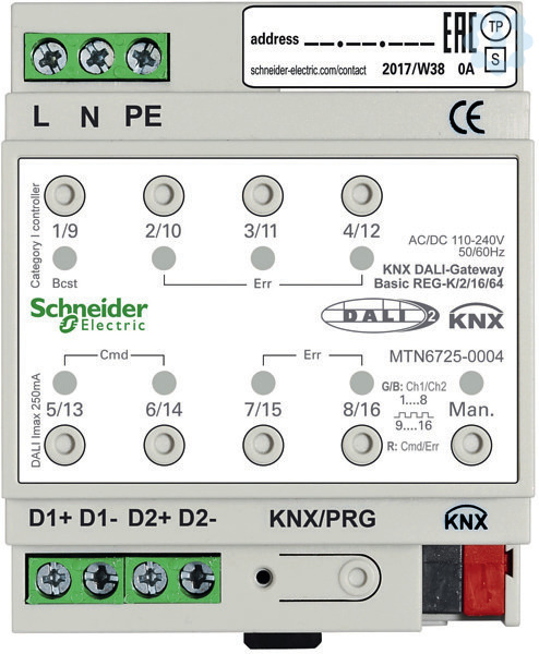 Schneider Electric KNX. Das KNX DALI Gateway verbindet den KNX Bus mit 2 DALI-Ausgängen. Das Gateway ist ein DALI-Steuergerät der Kategorie I mit integrierter DALI Spannungsversorgung für die EVGs. Je DALI Ausgang können bis zu 64 EVGs in 16 Gruppen geschaltet und gedimmt sowie über 16 Szenen gesteuert werden. Außerdem können verschiedene Farbbefehle (zB Weißtonsteuerung, RGB, XY und HSV) zb von KNX Tastern interpretiert und DALI DT8 Leuchten entsprechend angesteuert werden.