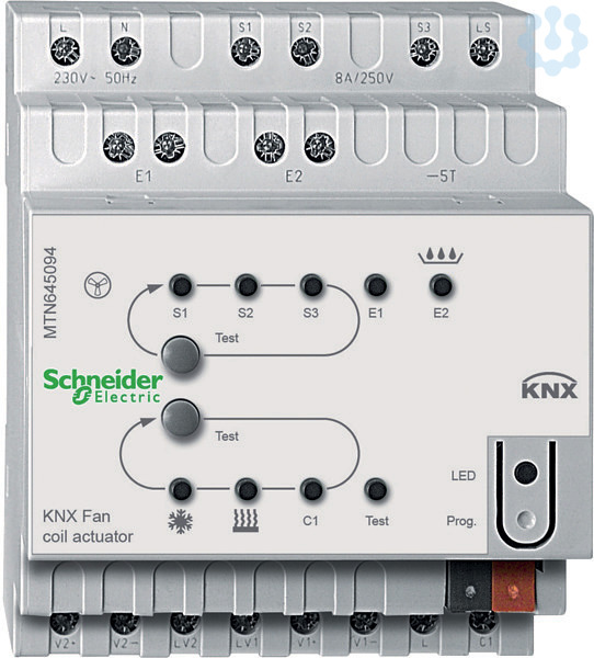 Schneider Electric KNX. Für die Heizungs-, Lüftungs- und Klimaregelung. Zur Ansteuerung von Ventilator-Konvektoren mit bis zu drei Geschwindigkeitsstufen sowie zur Ansteuerung von Dreipunkt-Motorantrieben (stetig/pulsweitenmoduliert) oder Zweipunkt-Thermoantrieben. Der Aktor unterstützt 2-Rohr- sowie 4-Rohr-Systeme. Zwei potentialfreie Binäreingänge für z. B Fensterkontakt und Füllstandskontakt für Kondenswasser-Auffangbehälter. Anschluss von 1- bis 3-stufigen Ventilatoren, Zur Ansteuerung des Fan Coil Aktors können die Taster plus mit Raumtemperaturregler verwendet werden. Mit integriertem Busankoppler. Für die Montage auf Hutschienen TH35 nach EN 60715. Der Busanschluss erfolgt über eine Busanschlussklemme. Spannungsversorgung: AC 230 V +/-10%, 50/60 Hz Leistungsaufnahme: max 3 VA, Ausgänge: 3 potentialfreie Kontakte (Fan Coil), 2 Halbleiterschalter (Ventilanschlüsse). Schaltleistung für Ventile: 0,5 A, AC 24V - 230 V, Schaltleistung Zusatzrelais: 16 A. Schaltleistung Lüfterrelais: 8 A. Eingänge: 2, max. Le