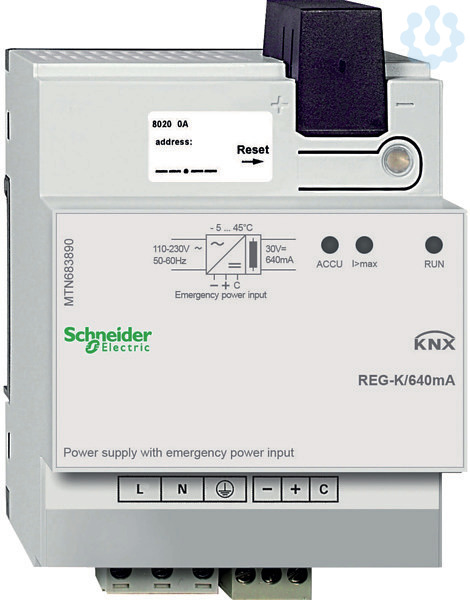 Schneider Electric KNX. Zur Erzeugung der Busspannung für eine Linie mit max. 64 Busteilnehmern. Zur Pufferung der Busspannung kann die Notstromversorgung REG angeschlossen werden. Mit integrierter Drossel zur Entkopplung der Spannungsversorgung vom Bus sowie einem Taster zur Spannungsunterbrechung und zum Rücksetzen der an der Linie angeschlossenen Busteilnehmer. Für die Montage auf Hutschienen TH35 nach EN 60715. Der Busanschluss erfolgt über eine Busanschlussklemme, eine Datenschiene ist nicht erforderlich. Netzspannung AC 110 - 230 V, 50-60 Hz, Ausgangsspannung DC 30 V, Ausgangsstrom max 640 mA, kurzschlussfest. Gerätebreite 4 TE entspricht ca 72 mm, Lieferumfang Mit Busanschlussklemme und Leitungsabdeckung.