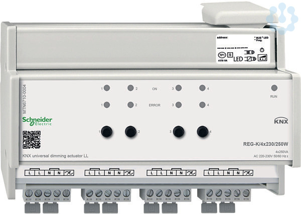 Schneider Electric KNX. Zum Schalten und Dimmen von dimmbaren LED-Lampen, Glühlampen, HV-Halogenlampen, NV-Halogenlampen über dimmbare gewickelte Trafos oder elektronische Trafos oder dimmbare Kompaktleuchtstofflampen. (Phasenan- und Phasenabschnitt). Mit integriertem Busankoppler, Schraubklemmen, Kurzschluss-, Leerlauf- und Übertemperaturschutz, lampenschonender Soft-Start. Der Anschluss von verschiedenen Außenleitern ist zulässig. Der Dimmaktor erkennt automatisch die angeschlossene Last. Dies erfolgt beim Einschalten im Hintergrund. Es können auch Kombinationen aus ohmschen und induktiven bzw ohmschen und kapazitiven Lasten angeschlossen werden. Kombinationen aus induktiven und kapazitiven Lasten dürfen nicht angeschlossen werden. Kein Flackern von LEDs in ausgeschaltetem Zustand. Für die Montage auf Hutschienen TH35 nach EN 60715. Der Busanschluss erfolgt über eine Busanschlussklemme. Nennspannung AC 220 - 230 V, 50/60 Hz, Kanäle 4 (verschiedene Phasen möglich). Nennleistung 4x250 W/VA, Bei 3 Kanälen 1x35