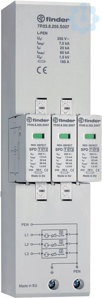Blitz- und Überspannungsableiter Typ 1+2 für 40 mm Sammelschiene, 7,5 kA pro Pfad, 4-Leitersystem, L1, L2, L3, PEN, austauschbare Module, optische Defektanzeige, Haltesystem für die Module, einsetzbar für die Ableitung von Blitzströmen bis 7,5 kA pro Pol, Installation im Vorzählerbereich an der Schnittstelle der Zonen LPZ 0 zu LPZ 1, ohne Leckstrom und Folgestrom