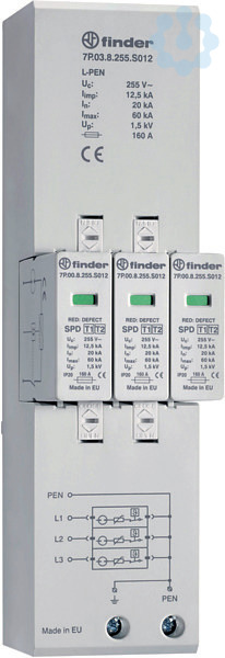 Blitz- und Überspannungsableiter Typ 1+2 für 40 mm Sammelschiene, 12,5 kA pro Pfad, 4-Leitersystem, L1, L2, L3, PEN, austauschbare Module, optische Defektanzeige, Haltesystem für die Module, einsetzbar für die Ableitung von Blitzströmen bis 12,5 kA pro Pol, Installation im Vorzählerbereich an der Schnittstelle der Zonen LPZ 0 zu LPZ 1, ohne Leckstrom und Folgestrom