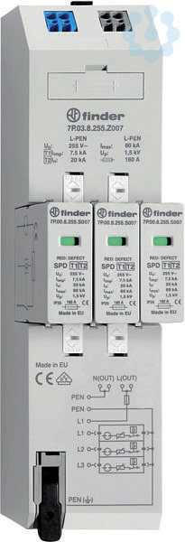 Blitz- und Überspannungsableiter Typ 1+2 für 40 mm Sammelschiene, 7,5 kA pro Pfad, 4-Leitersystem, L1, L2, L3, PEN, austauschbare Module, optische Defektanzeige, Haltesystem für die Module, einsetzbar für die Ableitung von Blitzströmen bis 7,5 kA pro Pol, Installation im Vorzählerbereich an der Schnittstelle der Zonen LPZ 0 zu LPZ 1, ohne Leckstrom und Folgestrom, inklusive überstromgeschützter 230 V Spannungsversorgung für RfZ / APZ nach VDE-AR-N 4100