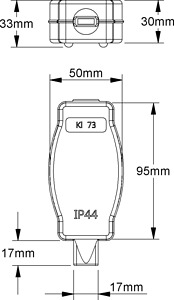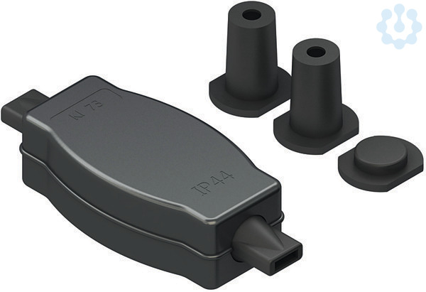 Kombidose, mit beidseitigem Schutzleiteranschluss und beidseitiger Zugentlastung sowie fünf Gummiadapter, zum Verbinden von zwei max. 3-adrigen Rundleitungen, zum Verbinden von 2-adrigen Illuminationsflachleitung H05RNH2-F (13,5 x 5,5 ± 0,5 mm), nach DIN EN 50525-2-82, zum Verbinden von einer max. 3-adrigen Rundleitung und einer 2-adrigen Illuminationsflachleitung H05RNH2-F (13,5 x 5,5 ± 0,5 mm), nach DIN EN 50525-2-82, halogenfrei. Die Kombidose besteht aus dem Dosenkörper mit innenliegender Schraubklemme zur Verbindung der Phasen- und Nullleiter und einem Messing Klemmbolzen für die beiden, eventuell vorhandenen Schutzleiter. Eine Verbindung von drei- mit zweiadrigen Leitungen sowie die Kombination unterschiedlicher Querschnitte ist nicht zulässig. Die Schutzart IP44 wird erreicht durch die Verschraubung von Dosenunter- und Oberteil. Abmessungen (ca. Maße) H x B x L : 33 x 50 x 95 mm Nennspannung